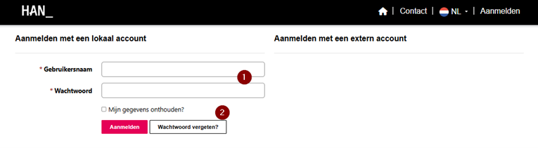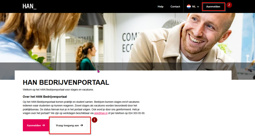 Het HAN Bedrijvenportaal is alleen toegankelijk voor gebruikers met een gebruikersnaam en wachtwoord. Wil je toegang tot het HAN Bedrijvenportaal om stages en/of vacatures aan te bieden? Registreer je dan via 'vraag toegang aan' ➀. Zodra je de aanvraag is verwerkt, ontvang je van ons een e-mail met je aanmeldgegevens. Meld je aan via 'Aanmelden'. ➁